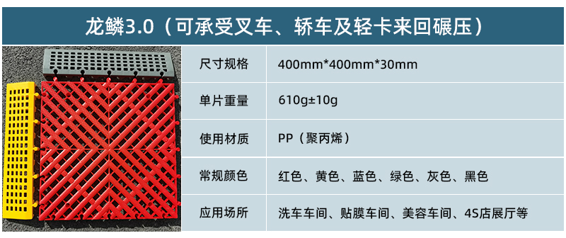 1.龍鱗紋設(shè)計,防滑,美觀,寓意好 2.選用高級原料,加入其他輔料,顏色亮麗,無異味,無污染 3.顏色為紅黃藍綠黑灰六色,滿足客戶用色需求,搭配屬于自己的風格 4.通扣鎖扣設(shè)計,容易鋪設(shè)且容易拆卸打理 5.加強支撐,不容易出現(xiàn)壓壞壓斷現(xiàn)象,滿足大多數(shù)車輛施工的要求 6.使用年限長,3年超長質(zhì)保,使用無后顧之憂 7.不同厚度,采用不同支撐,保證承載最大化的同時,且易排泥排水